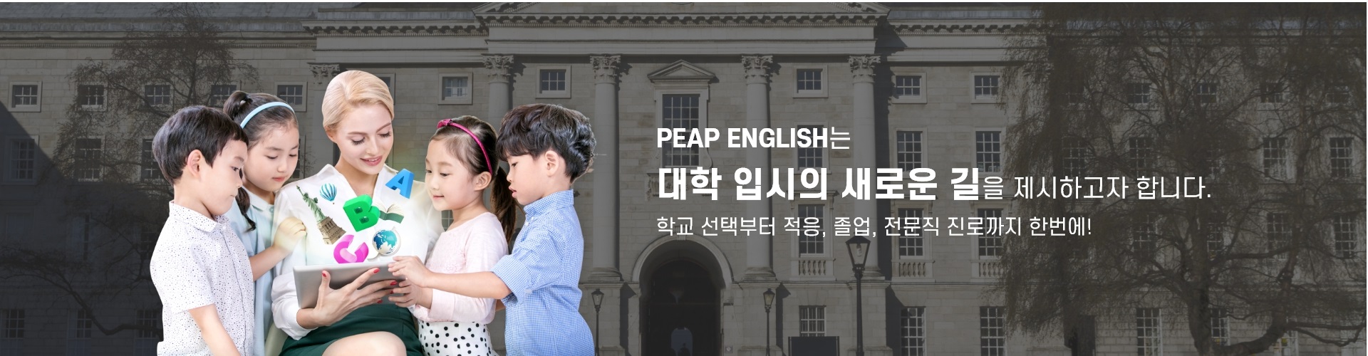 PEAP English 방문을 진심으로 환영합니다. PEAP English를 방문하셨다는 것은 이미 글로벌 진출에 대한 의지가 있음을 표현하신 겁니다. 국내 대학입시는 수능, 내신 등 몇가지의 천편일률적인 전형도구로 학생들을 줄세우고 있습니다. 물론 세계 어느 나라에서나 경쟁은 있습니다. 하지만 그 경쟁이 상대적인 것이 아니라 자기자신과의 경쟁이라면 어떨까요? PEAP English는 이 물음에 해답을 드리고자 합니다. IEEA가 지난 15년간 자체 개발한 영어능력평가 도구를 기반으로 성공적으로 유학을 진행한 사례를 좀더 많은 학생들이 영어능력의 향상과 미국유학을 성공할 수 있게 돕고자 합니다. 제대로 된 영어교육프로그램을 온라인으로 제공하고 이를 초등학교부터 자유롭게 시작하고 영어능력향상과 더불어 PEAP 레밸별 수료를 통해 국내진학과 미국유학을 동시에 진행할 수 있습니다. 지금 바로 PEAP English에 도전해보세요. 놀라운 새로운 영어교육 프로그램을 경험할 수 있습니다. 감사합니다. PEAP English 일동 |
